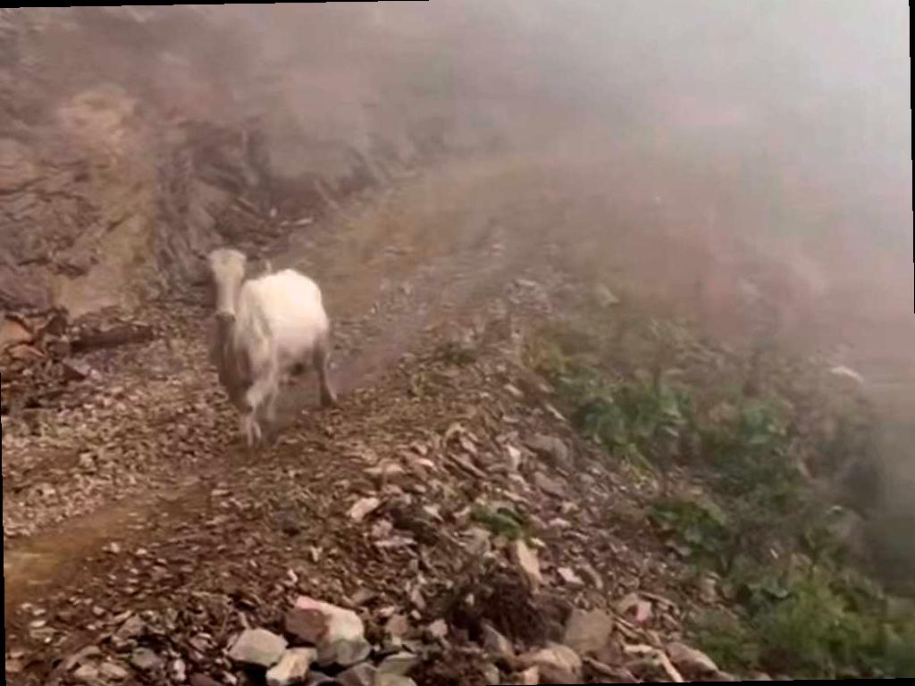 Группа туристов столкнулась с дикой коровой на узкой каменистой тропе. Животное подошло к ним с энергичным аллюром, не сводя взгляда с оператора, который успел снять этот необычный момент.
