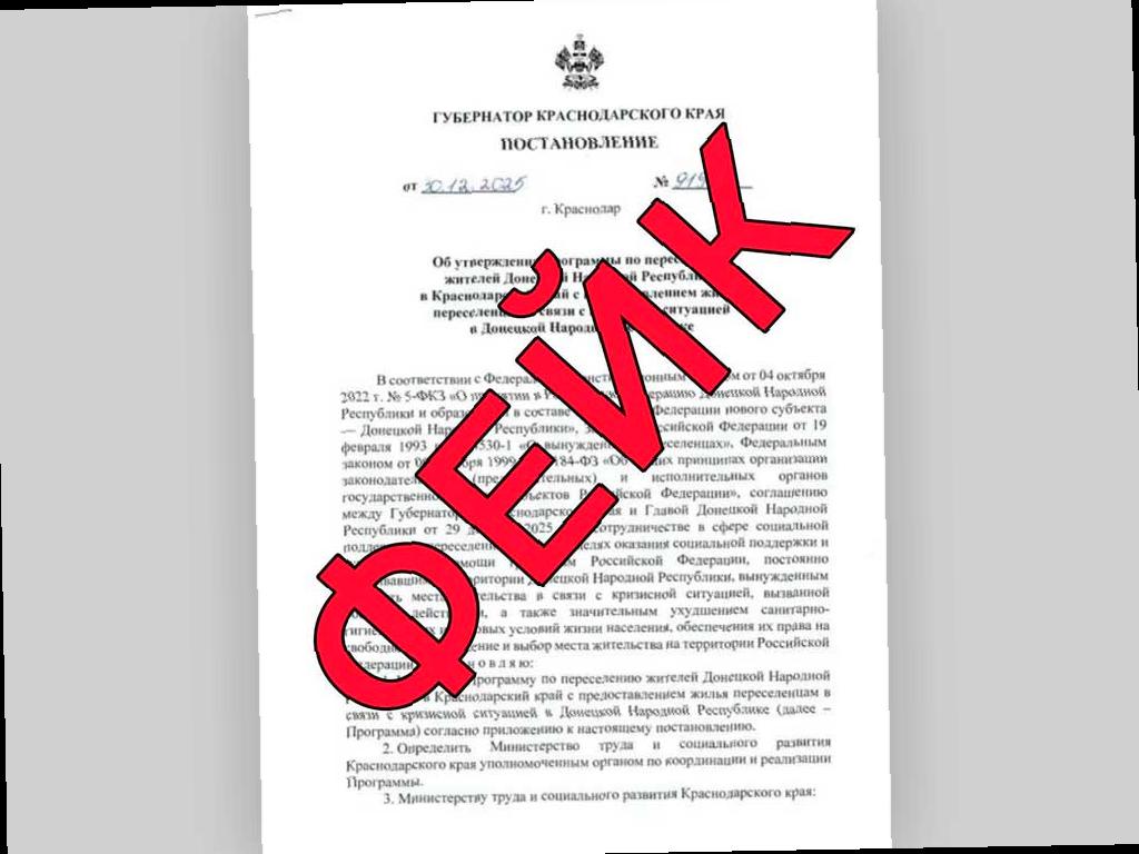 В оперативном штабе Краснодарского края сообщили о появлении фейковой новости. В интернете распространяется поддельное постановление губернатора о предоставлении жилья жителям ДНР на территории региона. По этому документу якобы в связи с кризисом в ДНР была утверждена программа переселения.